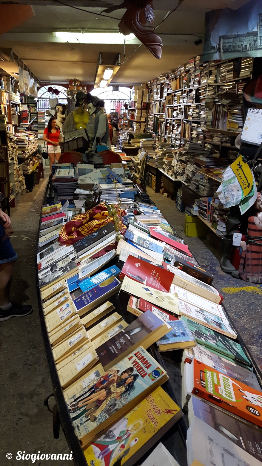 Per salvaguardare i moltissimi volumi dall’acqua che entra via via nel negozio, non ci sono mensole o scaffali, bensì gondole, canoe, barchette e vasche. Non esiste neppure un catalogo digitale per scovare più facilmente il libro desiderato, ma vi potrete comunque affidare al proprietario che probabilmente conosce a memoria la collocazione di molte opere.
